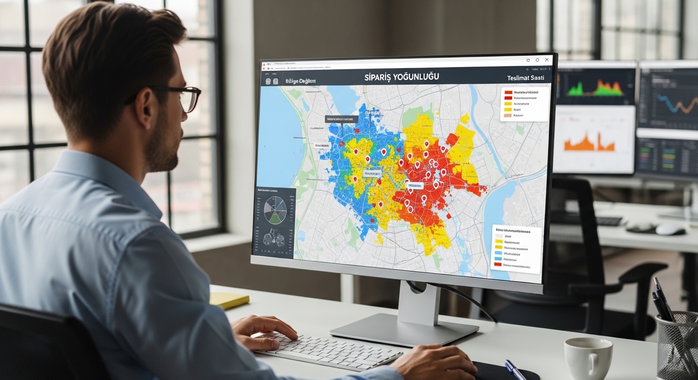 Sipariş yoğunluğu analiz edilirken ilk olarak coğrafi dağılıma bakılmalıdır. Bazı günler siparişler tek bir bölgede kümelenebilirken bazı günler daha dağınık olabilir. Tek bölgede yoğunlaşan siparişler araç başına daha yüksek teslimat sayısı sağlayabilir. Buna karşılık farklı semtlere yayılmış siparişler aynı araçla verimli biçimde tamamlanamayabilir. Bu nedenle sipariş yoğunluğu yalnızca adet olarak değil, mekansal dağılım olarak da okunmalıdır. Eğer bu ayrım yapılmazsa bazı araçlar aşırı yükle çıkar, bazı araçlar ise düşük yoğunlukla yola çıkar.